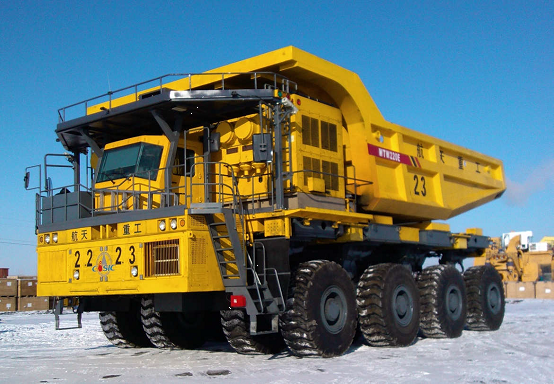 新型節(jié)能多軸重型礦用自卸車,已經(jīng)載重220噸進行了2000公里的路面各項試驗,在內(nèi)蒙古露天礦克服當?shù)亓阆滤氖鹊膼毫犹鞖鈼l件,每天分三班正式運行。該車采用4軸線、8個懸架、16×16輪驅(qū)動、輪轉(zhuǎn)向等結(jié)構(gòu)形式,綜合運用了雙發(fā)動機聯(lián)合動力、車輪立電驅(qū)動技術(shù)、大行程液壓懸架、擺動軸技術(shù)、箱型車架、液壓制動和轉(zhuǎn)向、遠程監(jiān)控自動診斷等先進技術(shù),提高了車輛道路適應性,降低了道路維護頻次和成本,延長了輪胎壽命,同時具有轉(zhuǎn)彎半徑小、機動性能好、供貨周期短、采購及維護成本低等優(yōu)點,別適應于大中型露天礦山開采運輸和大型工程施工。